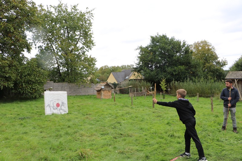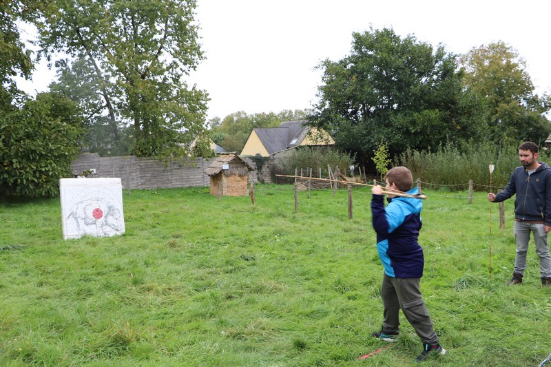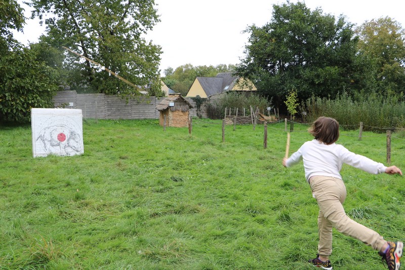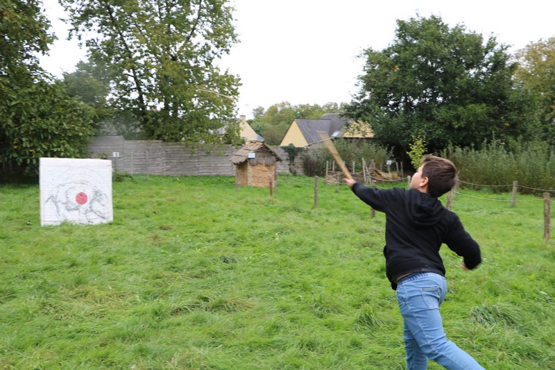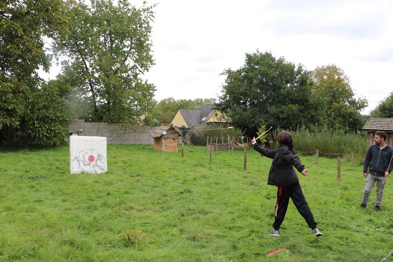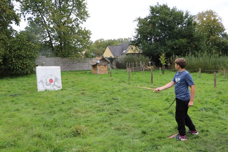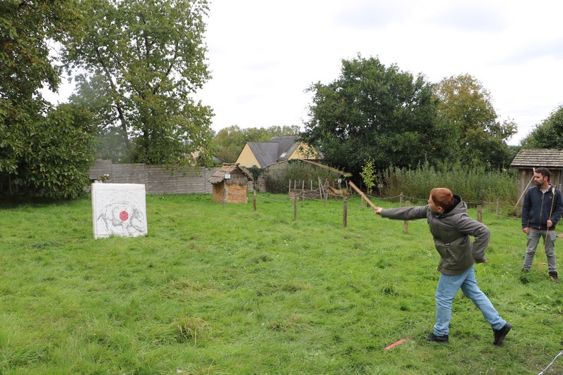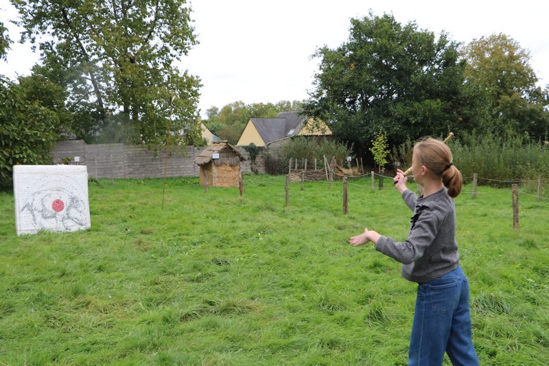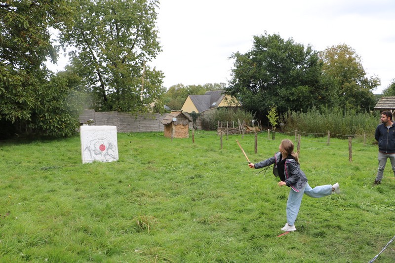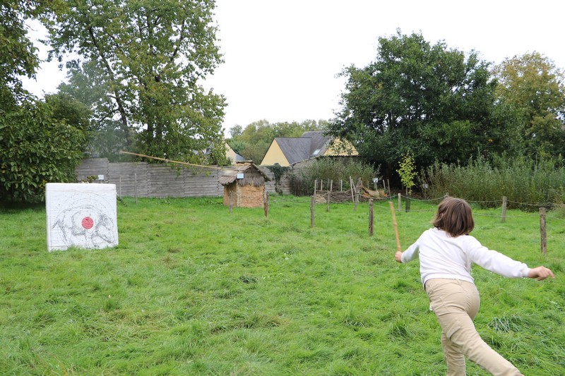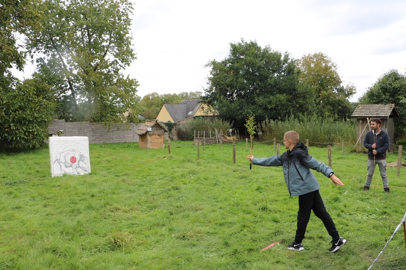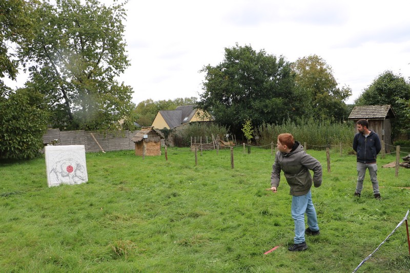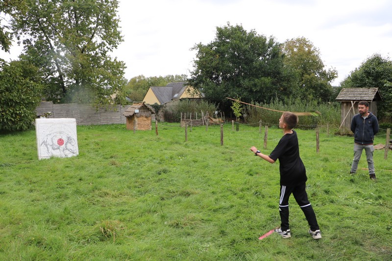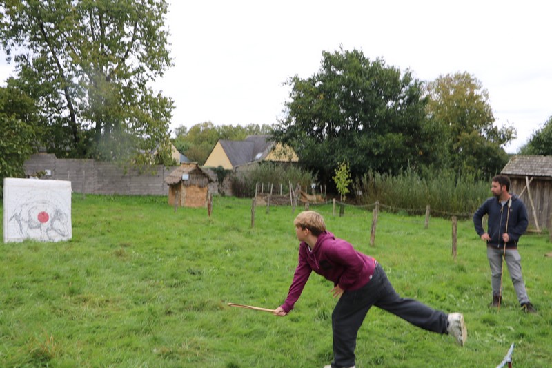 Atelier chasse — Initiation au propulseur pour lancer des sagaies : beaucoup d’enthousiasme, quelques tirs maladroits… et heureusement, aucune blessure à déclarer ! Des vocations sont par contre nées !