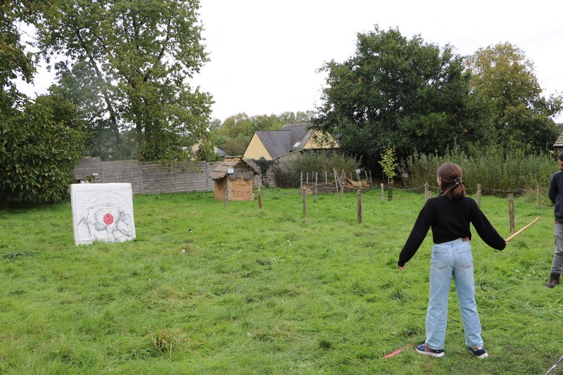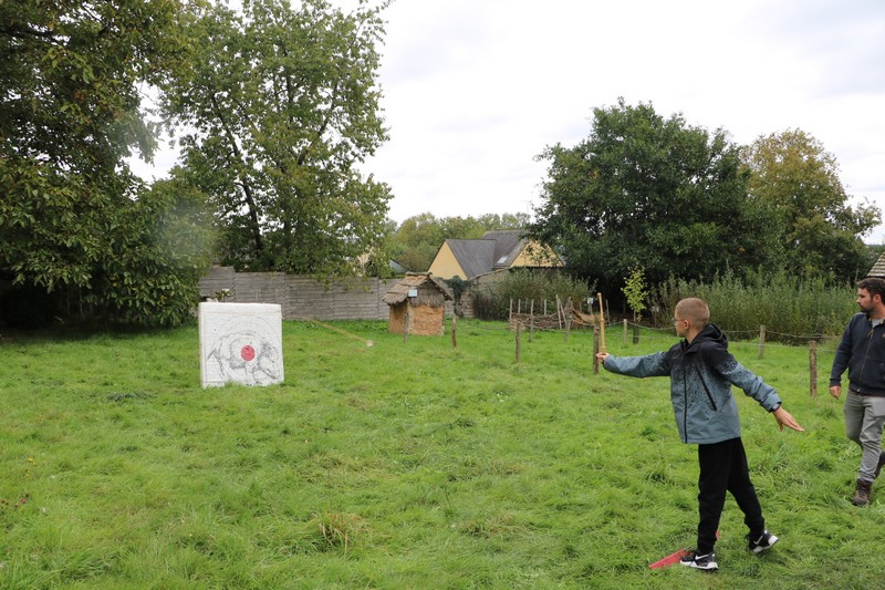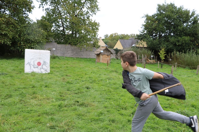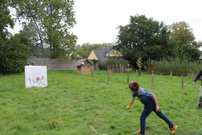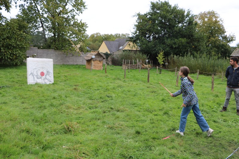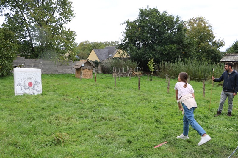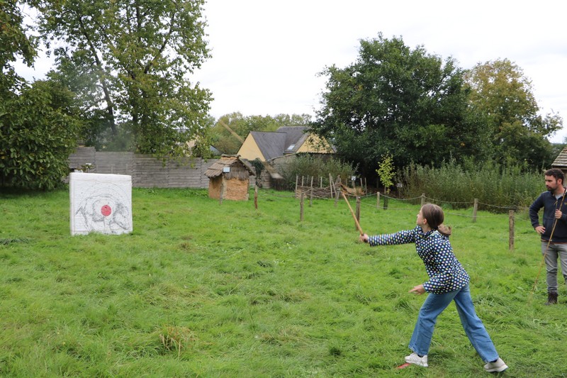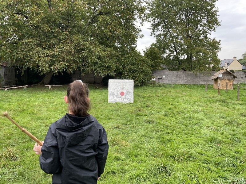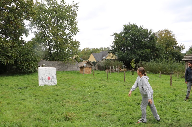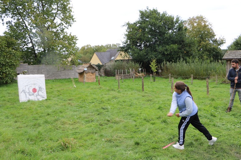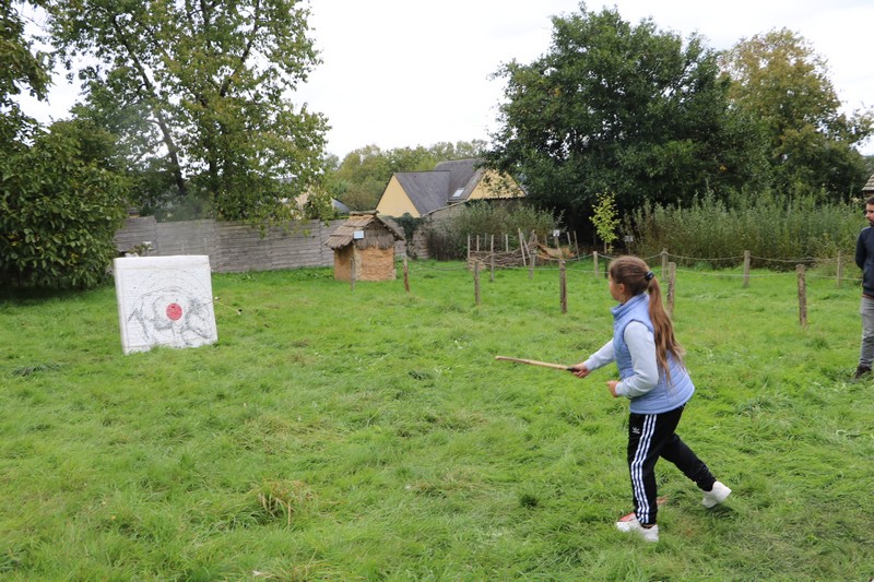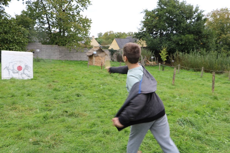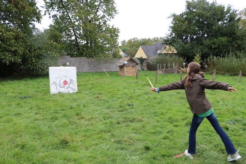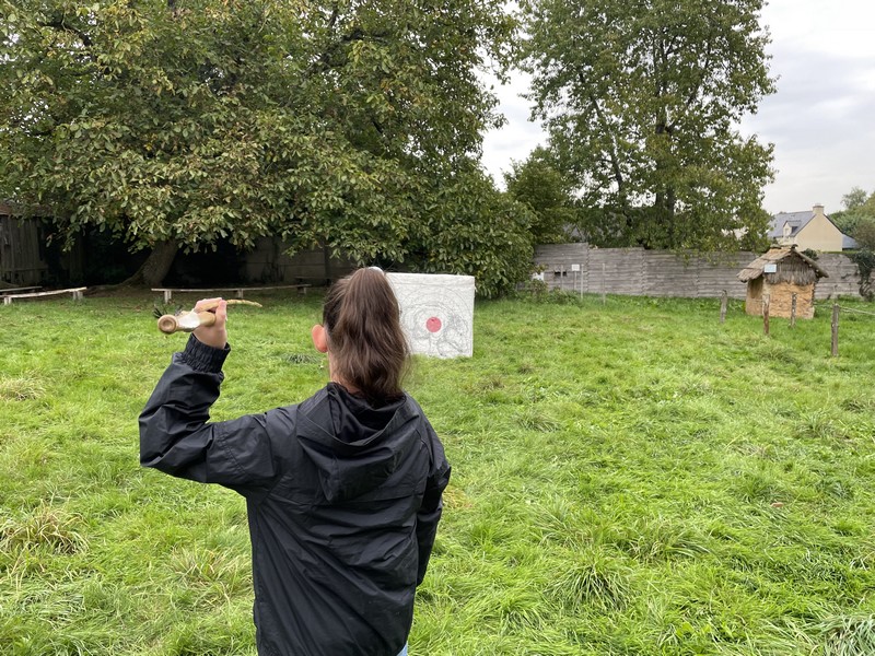 Atelier chasse — Initiation au propulseur pour lancer des sagaies : beaucoup d’enthousiasme, quelques tirs maladroits… et heureusement, aucune blessure à déclarer ! Des vocations sont par contre nées !