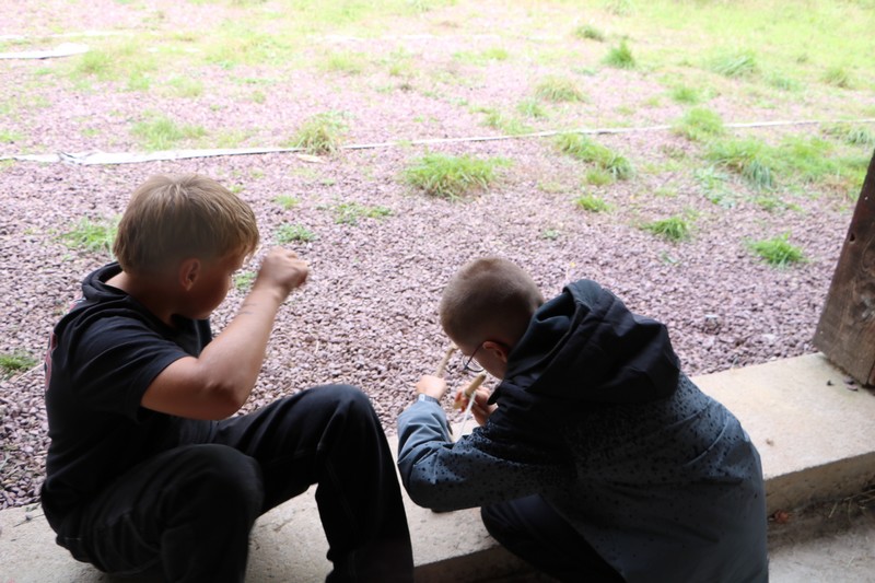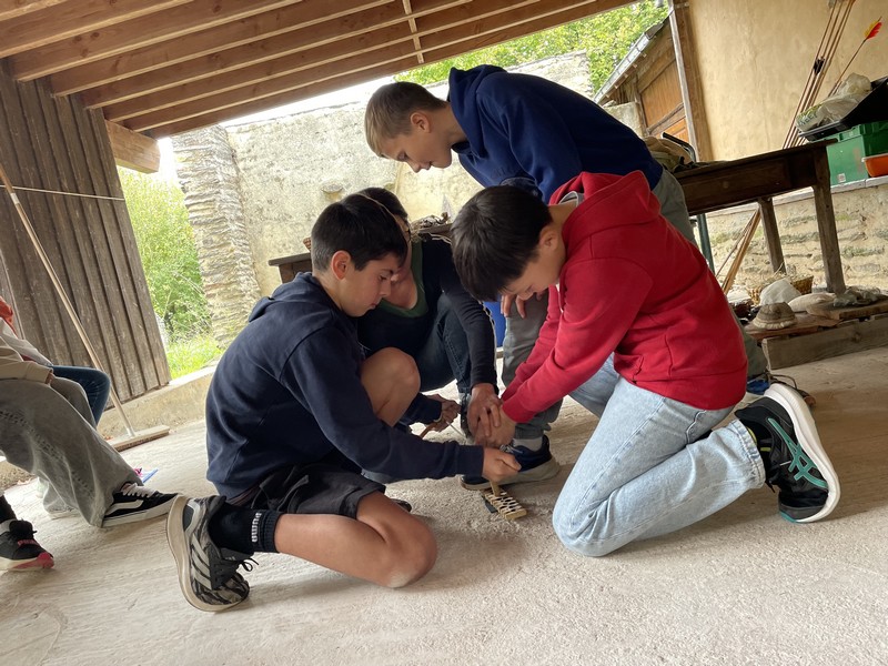 Atelier feu — Le défi du jour ! Malgré des efforts acharnés, rares sont ceux qui ont réussi à allumer une flamme. Comme l’a dit un élève : « C’est encore plus dur que dans Koh Lanta ! »
